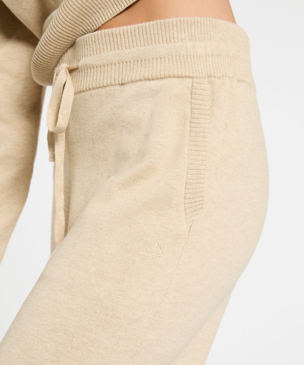 Model wearing grey knit jumper and wide-leg pants standing barefoot on rocky shore at sunset
