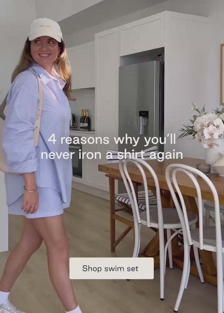 Model wearing lightweight On-The-Move shirt Model wearing striped shirt and shorts set with white tee, holding coffee