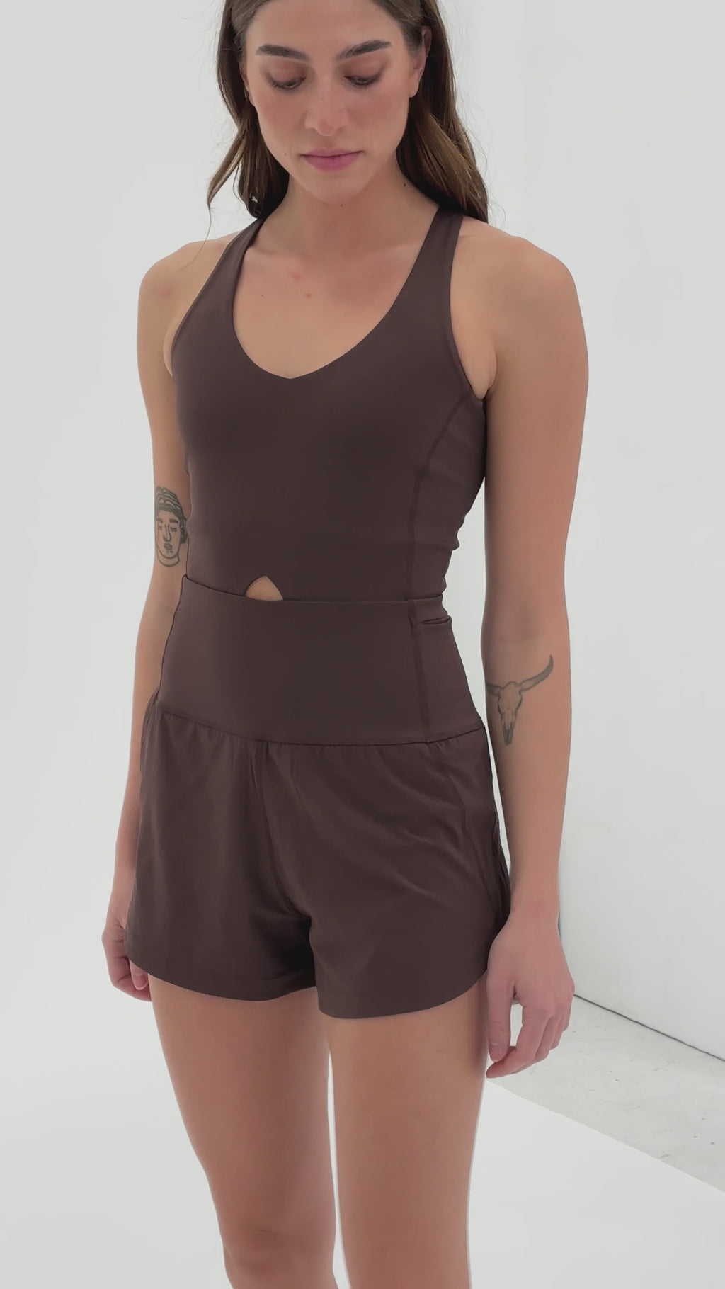 Scoop crop top and bike short set in deep espresso, designed for all-day comfort and movement Close-up of scoop back black crop showing smooth seams and subtle logo detail